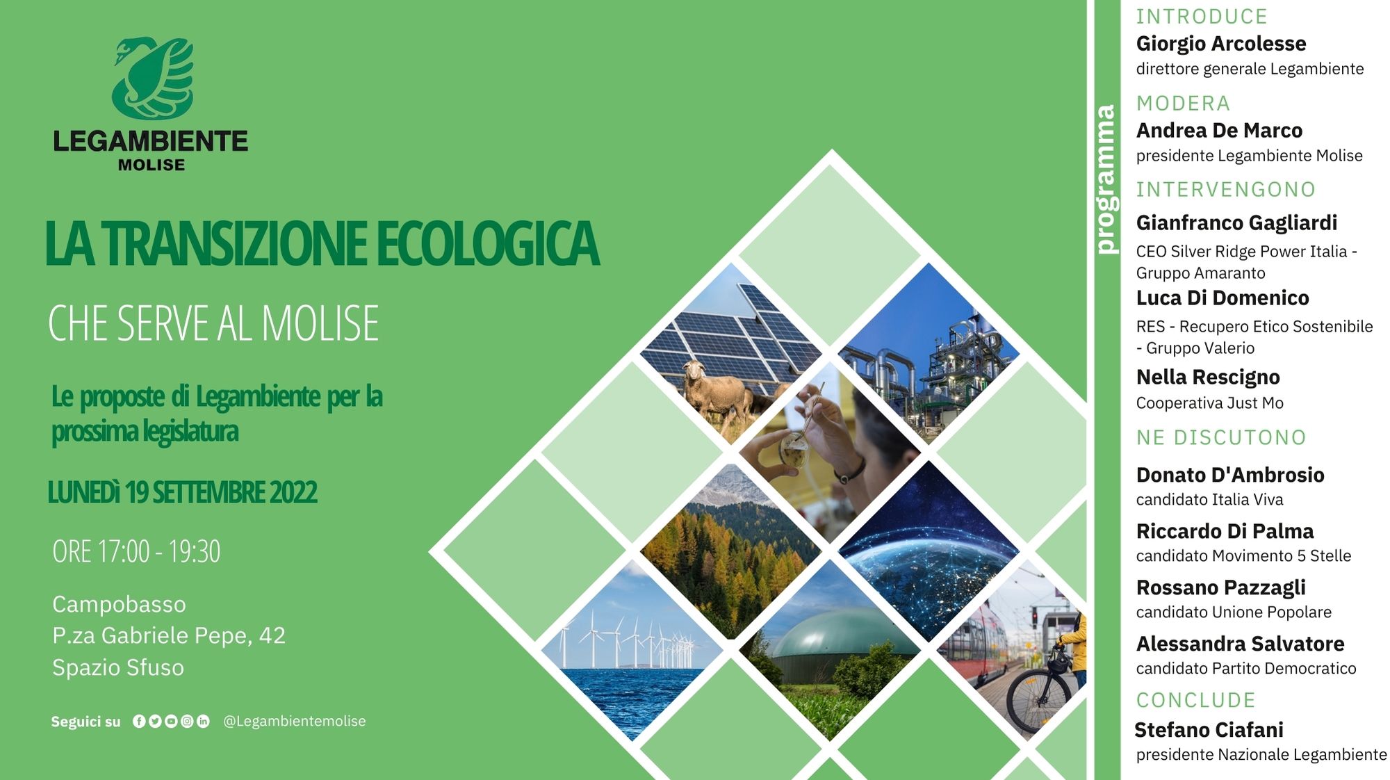 Questo pomeriggio si terrà l'incontro "La Transizione ecologica che serve al Paese - Le proposte di Legambiente per la prossima legislatura" presso Spazio Sfuso della cooperativa JustMo' in Piazza Gabriele Pepe a Campobasso alle ore 17:00.