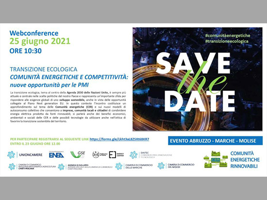 L’evento, organizzato da Unioncamere, in collaborazione con le Camere di Commercio di Molise, Abruzzo e Marche e patrocinato da ENEA, GSE e Politecnico di Torino, si terrà il 25 giugno alle 10:30.